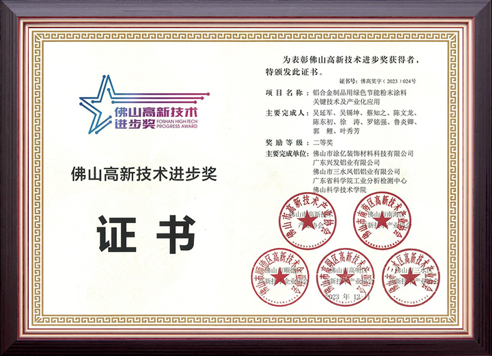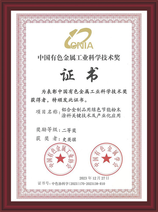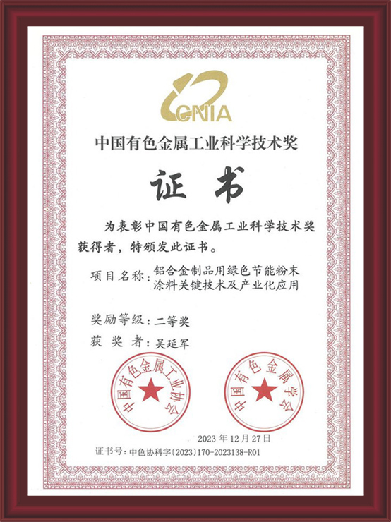 中国有色金属工业科学技术奖《铝合金制品用绿色节能粉末涂料关键技术及产业化应用》