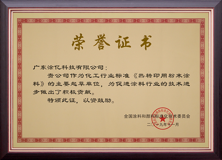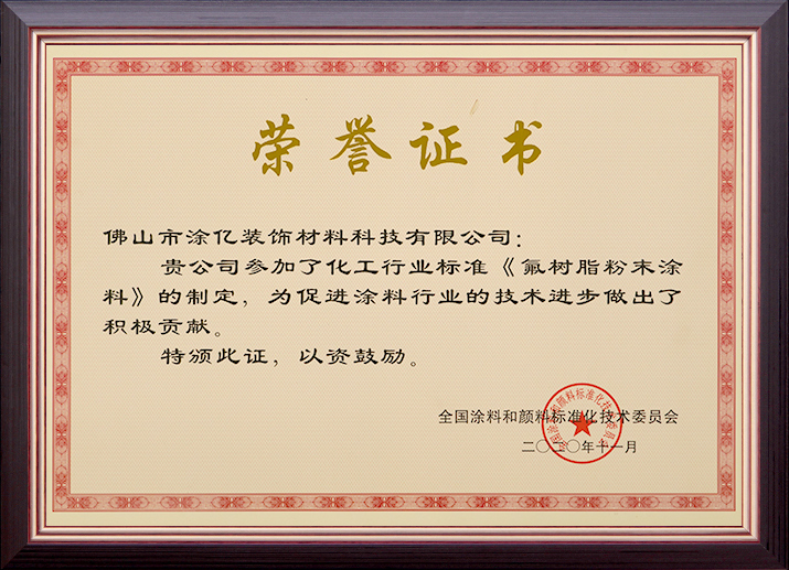 《氟树脂粉末涂料》化工行业标准制定贡献奖